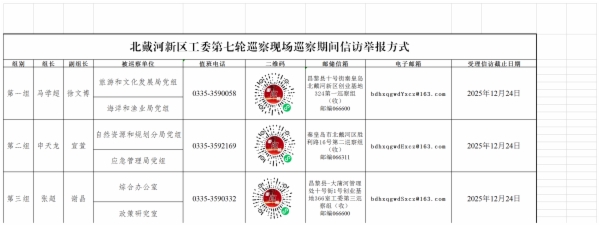 北戴河新区工委各巡察组在被巡察单位现场巡察时间为50天左右,巡察期间巡察组设值班电话、联系信箱、邮政信箱、电子邮箱和信访举报二维码受理群众的举报和反映。根据有关规定,北戴河新区工委巡察组主要受理反映被巡察党组织领导班子及其成员、下一级党组织领导班子主要负责人和重要岗位领导干部问题的举报和反映,重点是关于违反政治纪律、组织纪律、廉洁纪律、群众纪律、工作纪律、生活纪律以及违反中央八项规定及其实施细则精神等方面的问题反映。对于巡察受理范围之外的信访问题,将按规定移交有关单位或部门处理。巡察组受理信访时间截止到2025年12月24日。