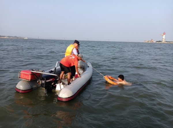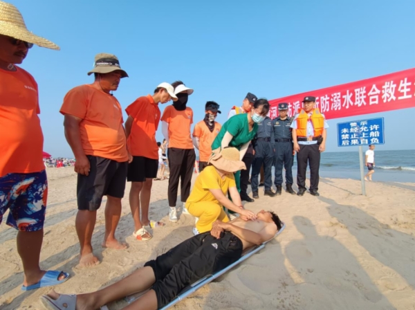 “发现人员溺水!救援组出动!担架组准备!”随着民警指挥员的一声令下,演练正式开始。演练模拟群众在海里游泳时体力不支腿部抽筋发生溺水,演练指挥员思路清晰,全体参演人员反应迅速、配合默契、措施有效,成功将“溺水群众”救援上岸。120急救人员现场教学,详细示范讲解了心肺复苏等急救措施。