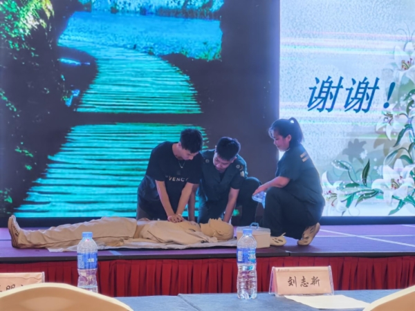 本次培训内容涵盖心肺复苏、海蜇蜇伤紧急救治办法、中暑的诊断与急救、意外伤害与创伤包扎、止血等常见救护技巧和注意事项。专家组针对可能遇到的各种紧急情况,通过现场讲解、亲身示范以及模拟互动的方式进行实际操作和互动演练,使每位参训人员都能够掌握实际操作技能,提高对紧急医疗状况的应对能力。