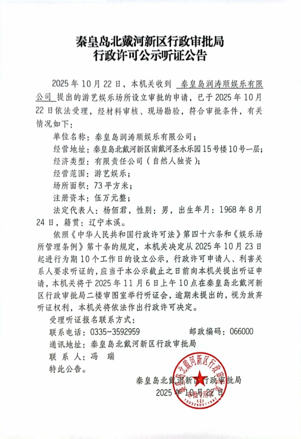 秦皇岛北戴河新区行政审批局行政许可公示听证公告