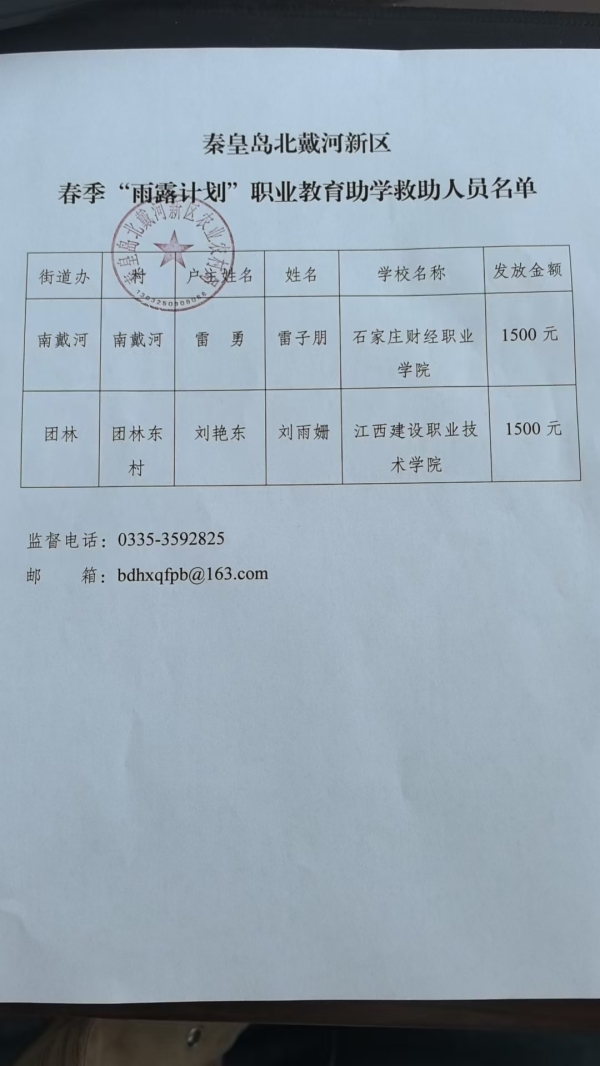 秦皇岛北戴河新区 春季“雨露计划”职业教育助学救助人员名单