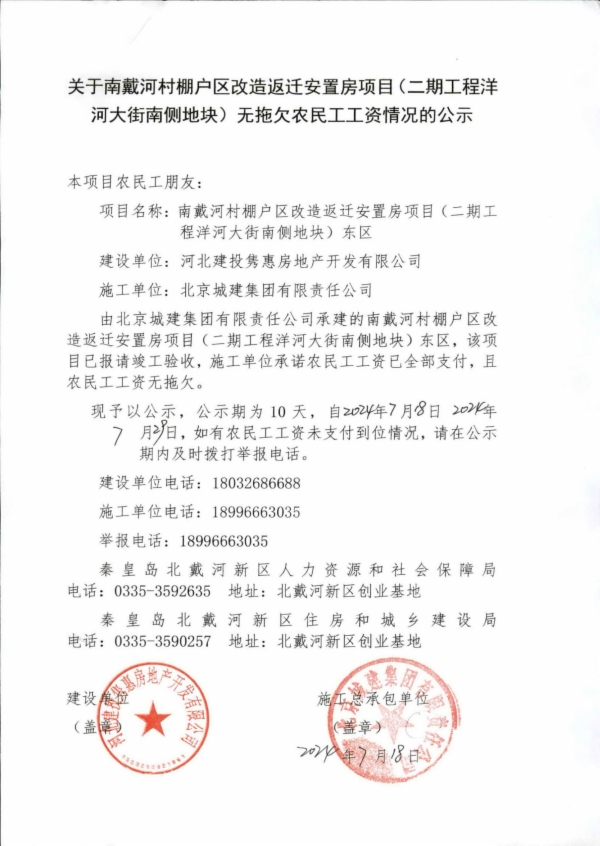 关于南戴河村棚户区改造返迁安置房项目(二期工程洋 河大街南侧地块)无拖欠农民工工资情况的公示