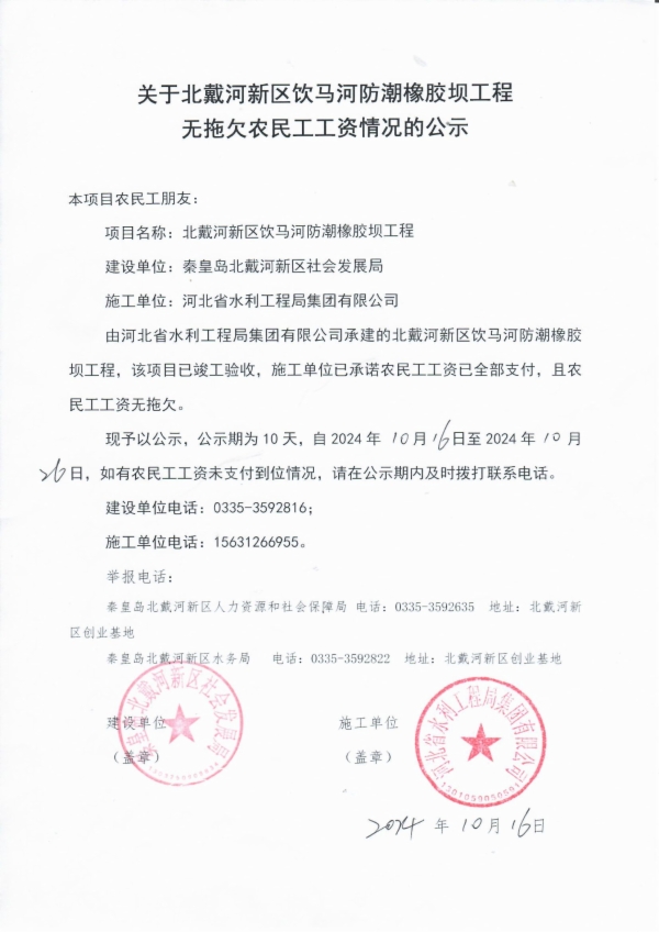 关于北戴河新区饮马河防潮橡胶坝工程 无拖欠农民工工资情况的公示