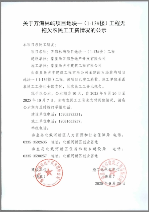 关于万海林屿项目地块一(1-13#楼)工程无拖欠农民工工资情况的公示