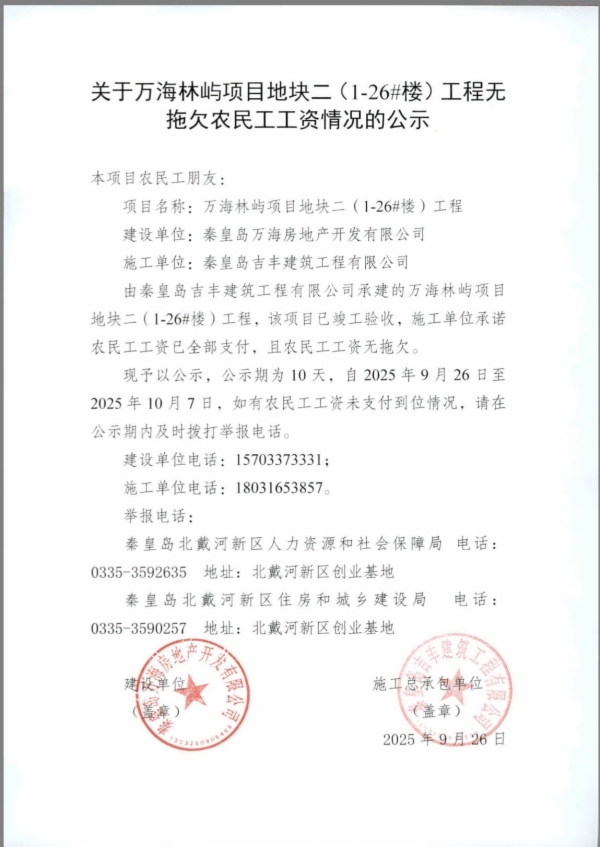 关于万海林屿项目地块二(1-26#楼)工程无拖欠农民工工资情况的公示