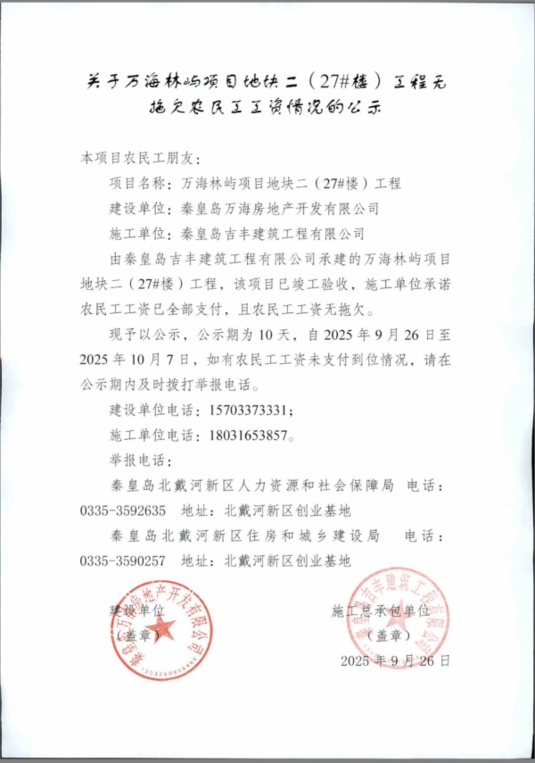 关于万海林屿项目地块二(27#楼)工程无拖欠农民工工资情况的公示