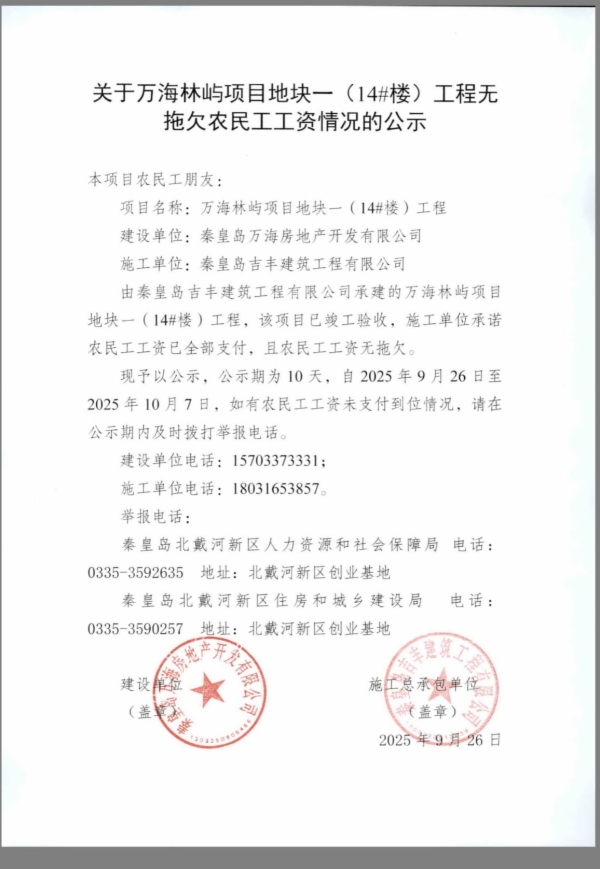 关于万海林屿项目地块一(14#楼)工程无拖欠农民工工资情况的公示