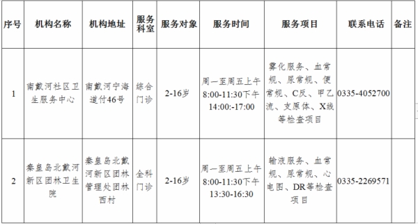 河北省秦皇岛北戴河新区提供儿科诊疗服务的基层医疗卫生机构名单