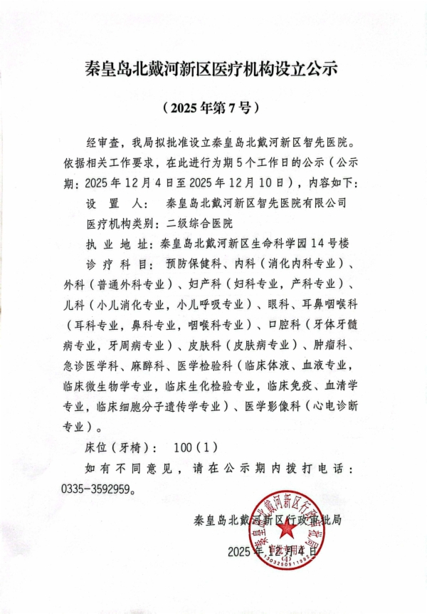 秦皇岛北戴河新区医疗机构设立公示 (2025年第7号)