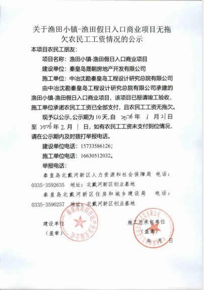 关于渔田小镇-渔田假日入口商业项目无拖欠农民工工资情况的公示