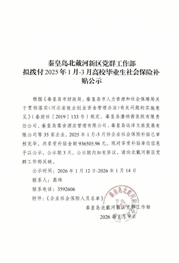 秦皇岛北戴河新区党群工作部拟拨付2025年1月-3月高校毕业生社会保险补贴公示