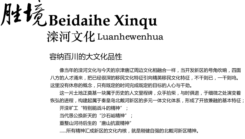 向前延,北戴河新区秉承了“西洋美人”的气质文化,也多了与更多近邻文化交融的人文气象。比如她南接滦河文化,形成的是内蒙、承德、唐山等7个地区4万多平方公里的广阔接触面。它的生产、生活方式,科教、文艺形式,都将丰富“北戴河新区”的内涵,影响新区的发展。