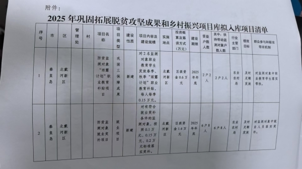 中共秦皇岛北戴河新区工委农村工作领导小组关于2025年巩固拓展脱贫攻坚成果和乡村振兴项目库拟入库项目公示